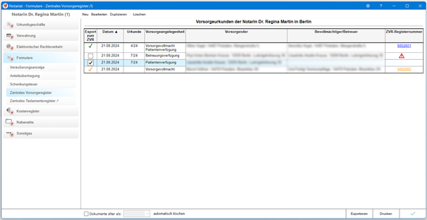 Die neue Schnittstelle für die Übergabe von Vorsorgeurkunden an das Zentrale Vorsorgeregister (ZVR) der Bundesnotarkammer wurde eingebunden. Der bisherige Datei-Upload wird von der Bundesnotarkammer zum 30.11.2024 eingestellt.