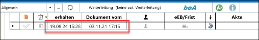 Die neue Spalte „Dokument vom“ ermöglicht eine klare Unterscheidung zwischen dem Einlesedatum (angezeigt in der Spalte „erhalten“) und dem tatsächlichen Dateidatum.