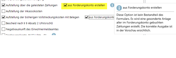 Hinter der den amtlichen Formularen immanenten Option “Aufstellung der geleisteten Zahlungen” und “Aufstellung der bisherigen Vollstreckungskosten” wurde eine neue Checkbox "aus Forderungskonto erstellen" eingeführt.